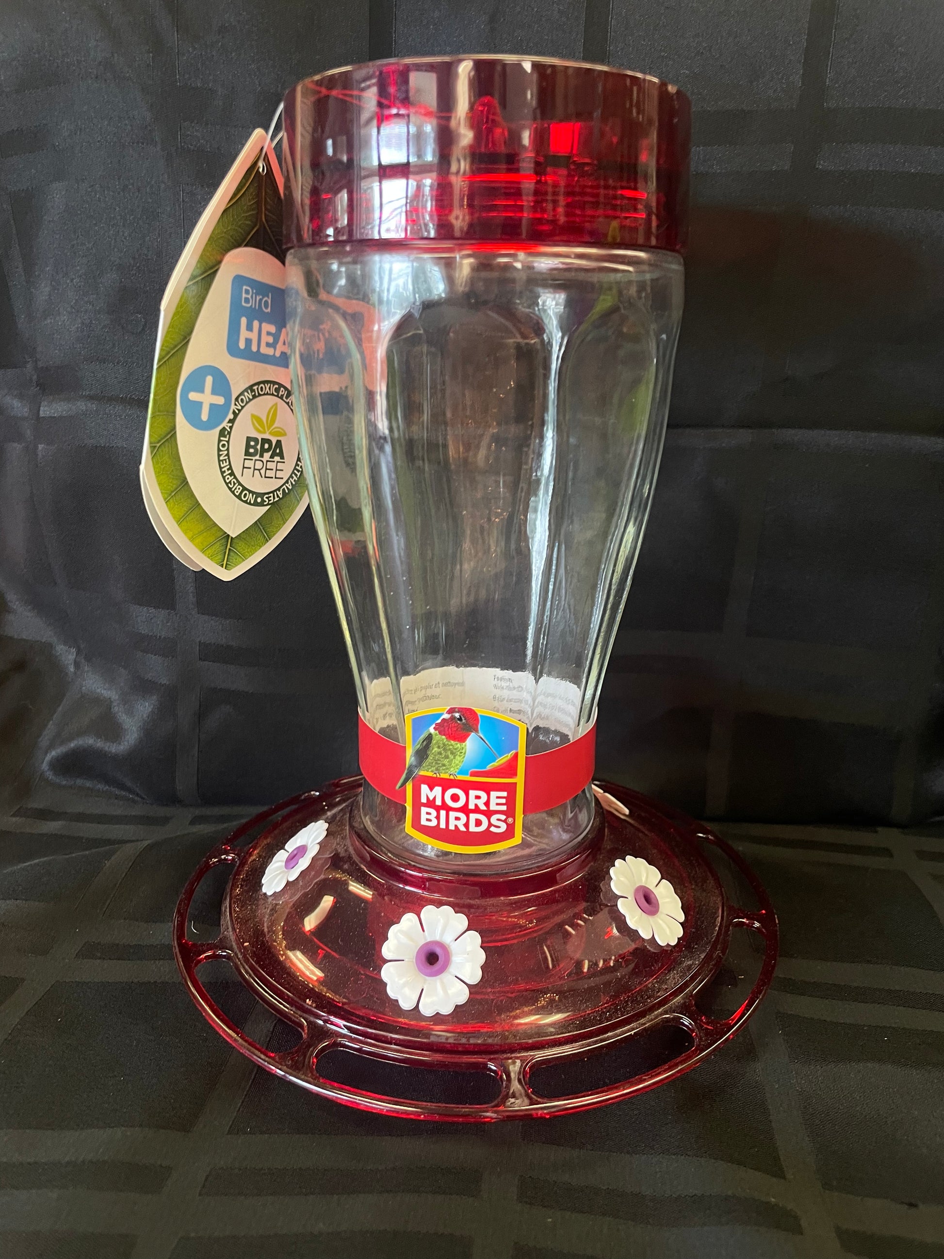 Birds help keep our ecosystem healthy, so help keep birds healthy too with the More Birds® Bird Health+™ collection. Bird Health+™ products are made of bird-safe, BPA-free materials and recyclable parts. The More Birds® Bird Health+™ Big Gulp Hummingbird Feeder features 5 soft ports and an integrated perch design that optimize the feeding angle and comfort for all species of hummingbirds. The Big Gulp features a glass nectar bottle and a colorful red top and base. The wide bottle opening and detachable flat base make filling easy and cleaning a breeze. The built-in ant moat stops ants right in their tracks, keeping precious nectar fresh for hungry hummingbirds. With a 40 oz. nectar capacity, the Big Gulp provides plenty of nectar to keep hummingbirds happy and coming back for more! For best results, use More Birds® Bird Health+™ nectar, which simulates natural nectar found in flowers.