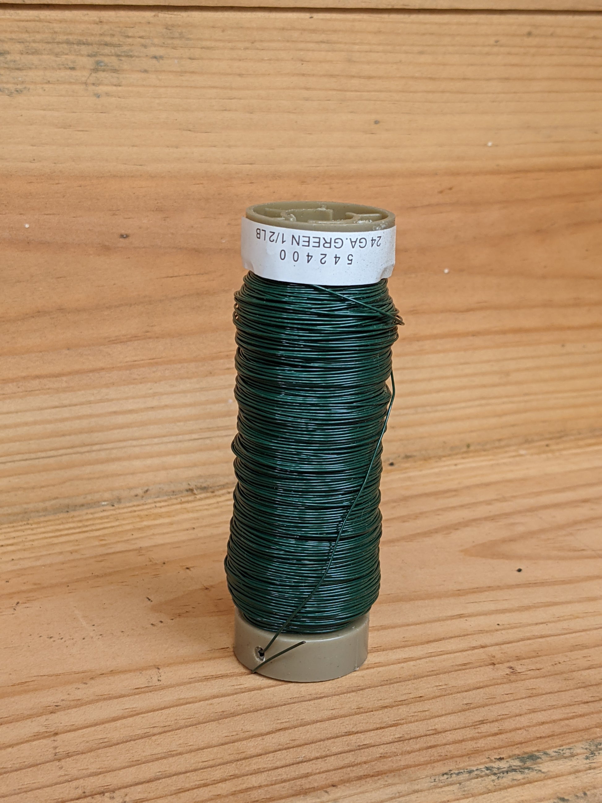 A spool of green 24 gauge wire. Great for use with floral decoration, Christmas wreaths, and any other projects.